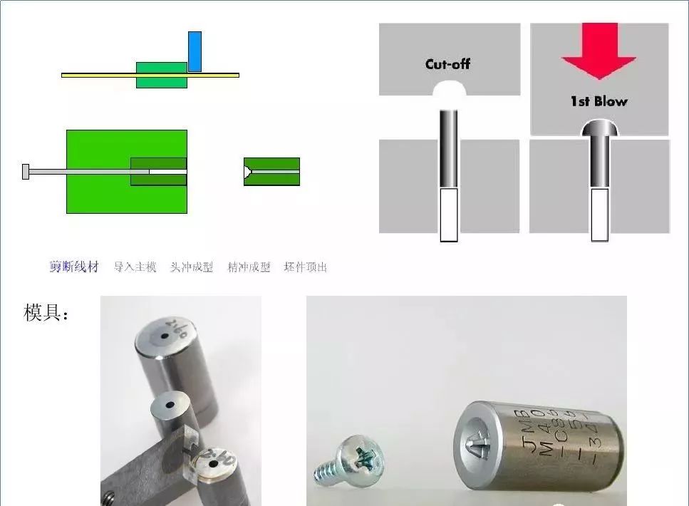 通过模具之间的相互作用,使之成型,先将线材切断,镦成螺丝坯件,形成头部,十字槽(或其它头型) 螺纹坯径及杆长,头下圆角等。