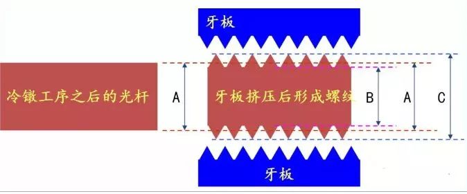 将冷镦好的坯件搓出螺纹,通过活动牙板与固定牙板的相互作用,使之牙纹成型。