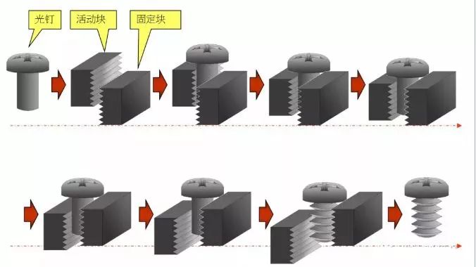 将冷镦好的坯件搓出螺纹,通过活动牙板与固定牙板的相互作用,使之牙纹成型。